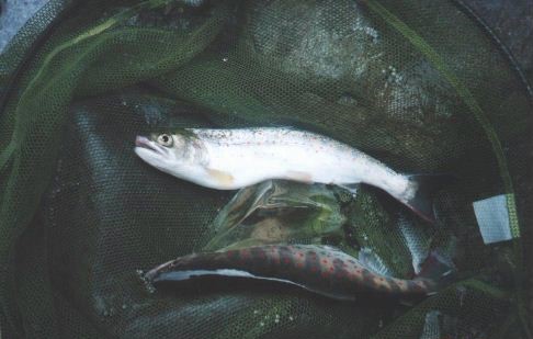 渓流 アマゴ 和歌山県の有田川では成魚放流アマゴの特別解禁が始まる・・・ 奥はシラメと呼ばれる降海型スモルトのギンケ